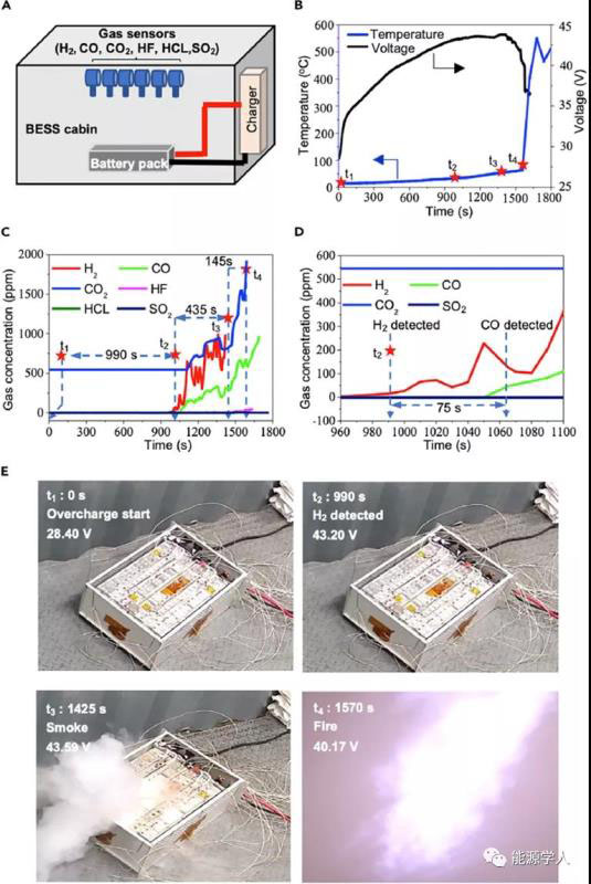 對商用電池組進行了過充電實驗,如圖4A所示。圖4B顯示了充電過程中的電壓分布和電池組表面溫度的變化。電池組持續(xù)過度充電而起火爆炸,約為43V(額定電壓值的1.68倍)。在此,實驗人員選擇了四個特殊的時間點來更好地闡述開發(fā)過程,即t1、t2、t3和t4。t1=0s為初始充電開始時間點;t2=990s為H2檢測時間點;t3=1425s為冒煙出現(xiàn)時間點;t4=1570s為火災爆炸時間點。實驗中檢測到的六種氣體的濃度變化,如圖4C和4D所示。圖4E顯示了t1–t4不同時間點的光學圖像。