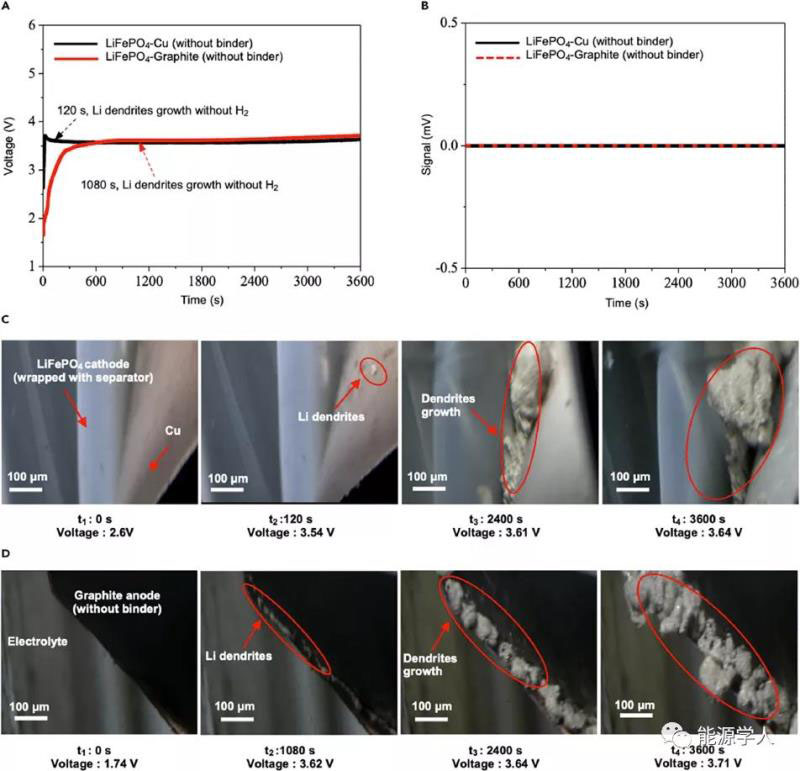 為了排除電解液還原及其他物質的干擾,作者組裝了另外兩個鋰離子電池(LiFePO4-Cu和LiFePO4-石墨電池),沒有任何聚合物粘結劑。圖3A顯示了電池在充電過程中的電壓曲線。對于LiFePO4-石墨電池,在1080 s時觀察到鋰枝晶生長,電池電壓約為3.6 V。在LiFePO4-Cu電池,鋰離子直接鍍在銅箔表面形成鋰金屬。然而,由于光學顯微鏡觀察的局限性,在120s左右觀察到鋰枝晶生長,電池電壓約為3.6V。