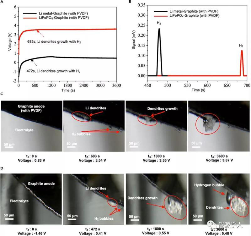 圖2C顯示了不同時間和電壓下,LiFePO4-石墨電池中,石墨負極的光學圖像。從683s到3600s,鋰枝晶繼續(xù)生長到微米尺度,并伴隨著H2氣泡。圖2D顯示了,不同時間和電壓下鋰金屬-石墨電池的光學圖像,和LiFePO4-石墨電池一樣,隨著鋰枝晶的生長,鋰枝晶底部產生H2氣體,鋰金屬與石墨電極中的聚合物粘結劑發(fā)生反應,聚集成大的H2氣泡。以上實驗結果表明,無論是在過充或正常充電條件下,一旦鋰枝晶開始與PVDF接觸,H2即會發(fā)生。