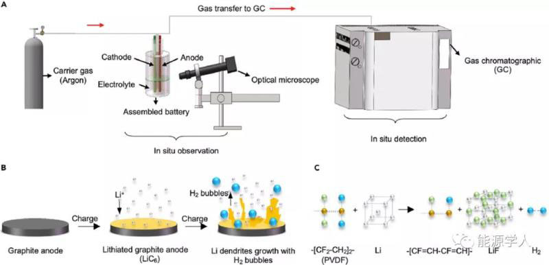 圖1 利用H2捕獲檢測鋰枝晶生長的示意圖(A)鋰枝晶生長的原位光學觀察和H2氣體的原位捕獲圖解;(B)H2氣體生成機制的圖示;(C)鋰枝晶與PVDF粘結劑的化學反應機理。