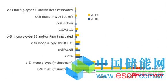 數(shù)據(jù)闡明事實(shí)。數(shù)據(jù)顯示了不同類型光伏產(chǎn)品在2010年和2013年的市場(chǎng)份額。因此,能夠相對(duì)容易的看出是什么技術(shù)在支配,而在過(guò)去三年中市場(chǎng)份額是怎么個(gè)變化。