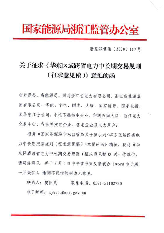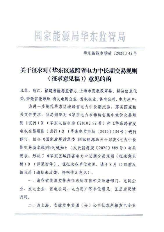7月21日,國家能源局華東能監(jiān)局發(fā)布關于征求《華東區(qū)域跨省電力中長期交易規(guī)則(征求意見稿)》意見的函,(華東監(jiān)能市場函【2020】42號)總十二章,126條。