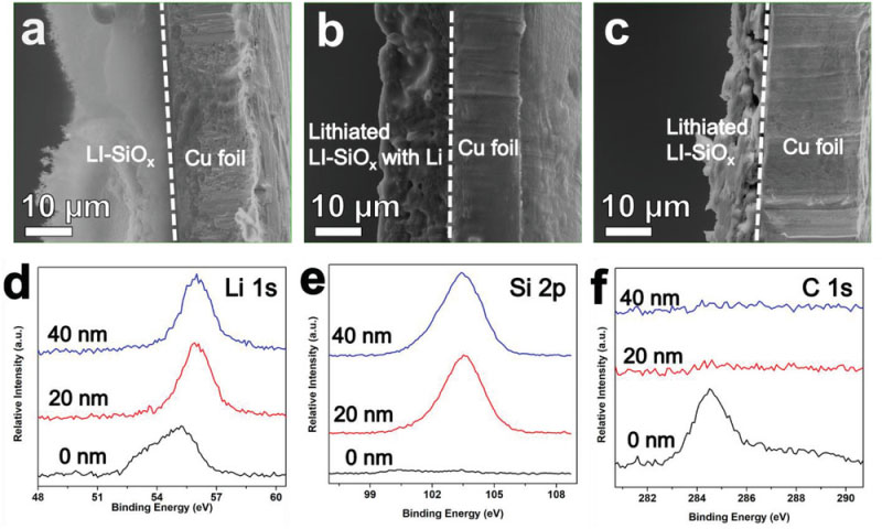 圖6. Li-SiOx包覆Cu箔的SEM側(cè)視圖及XPS表征(a) 嶄新的Li-SiOx包覆Cu箔SEM側(cè)視圖;(b) 經(jīng)過(guò)2 mAh cm?2 Li沉積后的Li-SiOx包覆Cu箔SEM側(cè)視圖;(c) Li脫出后的Li-SiOx包覆Cu箔SEM側(cè)視圖,白色虛線為邊界線;(d-f) Li-SiOx包覆Cu箔全電池100圈循環(huán)后的XPS表征。