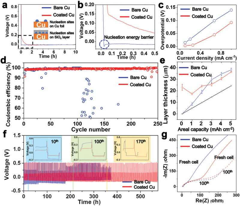圖3. 由Li-SiOx薄層包覆后的Cu箔組裝的半電池電化學(xué)性能測(cè)試(a,b) 0.1 mA cm-2電流密度下裸露Cu箔和Li-SiOx包覆Cu箔的電壓曲線,Cu箔表面的藍(lán)色圓點(diǎn)代表成核位點(diǎn);(c) 不同電流密度下裸露Cu箔和Li-SiOx包覆Cu箔的Li成核過(guò)電勢(shì);(d) 2.0 mA cm-2電流密度下裸露Cu箔和Li-SiOx包覆Cu箔的庫(kù)倫效率;(e) 不同面積比容量下裸露Cu箔和Li-SiOx包覆Cu箔的Li沉積厚度,黑線表示理論沉積厚度;(f) 2.0 mA cm-2電流密度下裸露Cu箔和Li-SiOx包覆Cu箔的電壓曲線;(g) 由裸露Cu箔和Li-SiOx包覆Cu箔組裝半電池循環(huán)前和循環(huán)100圈后的Nyquist圖。