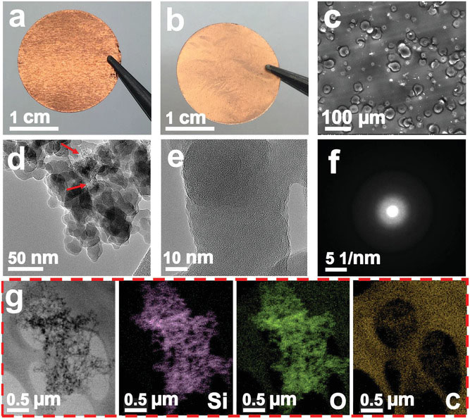 圖2. 包覆前后Cu箔與循環(huán)后Li-SiOx的表征(a) 裸露Cu箔的光學(xué)照片;(b) 包覆Li-SiOx后Cu箔的光學(xué)照片;(c) Li-SiOx薄層的SEM頂視圖;(d) Li-SiOx顆粒的TEM表征,紅色箭頭表示激光誘導(dǎo)產(chǎn)生的石墨;(e) Li-SiOx顆粒的HR-TEM表征;(f) Li-SiOx顆粒的SAED圖像(g) Li-SiOx顆粒的STEM圖像,紫色:Si;綠色:O;黃色:C。