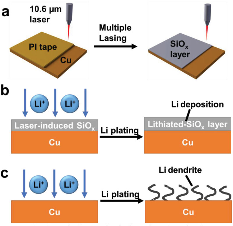 圖1. 在PI膠帶上利用激光誘導(dǎo)沉積SiOx薄層及后續(xù)Li沉積示意圖(a) 在Cu集流體表面利用激光形成SiOx薄層示意圖;(b) Li離子在SiOx薄層包覆后的Cu箔表面沉積示意圖;(c) Li離子在裸露的Cu箔表面沉積示意圖。