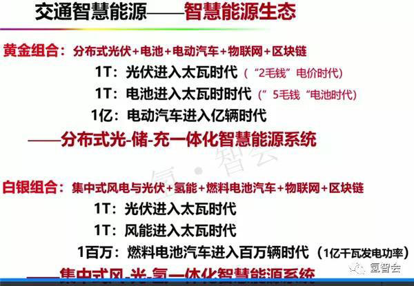 未來智慧能源生態(tài)將有兩個組合:一個是黃金組合——分布式光伏+電池+電動汽車+物聯(lián)網(wǎng)+區(qū)塊鏈;光伏進(jìn)入2毛錢電價,電池將會進(jìn)入5毛錢一瓦時的時代,電動汽車進(jìn)入了億輛時代;還有一個是白銀組合,就是集中式風(fēng)電與光伏+氫能+燃料電池汽車+物聯(lián)網(wǎng)+區(qū)塊鏈。