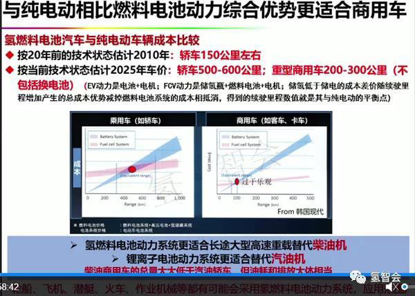 所以基于可再生能源,純電動和氫燃料電池優(yōu)勢凸顯。再看氫燃料電池和純電動車輛成本比較:20年前剛開始搞電動汽車專項(xiàng)時,按照當(dāng)時的技術(shù)狀態(tài),估計(jì)2010年純電動轎車只能跑150公里,150公里以上燃料電池就有優(yōu)勢。但是按照現(xiàn)在的狀態(tài)估計(jì)2025年車價,純電動轎車500-600公里內(nèi)都有成本優(yōu)勢。但是重型商用車,氫燃料電池300以上就有優(yōu)勢(這里不考慮換電重卡)。