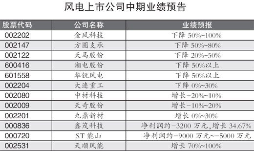 據(jù)不完全統(tǒng)計,截至6月28日,A股風(fēng)電上市公司已有12家公布半年業(yè)績預(yù)報,延續(xù)去年勢頭,9家公司業(yè)績預(yù)報同比下降,下滑趨勢未有減緩征兆。