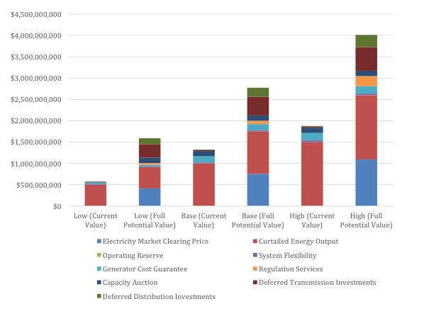 (1)電力批發(fā)市場(chǎng)節(jié)省的費(fèi)用:這是潛在節(jié)省成本的主要部分。其范圍從能源套利到減少對(duì)基本負(fù)荷發(fā)電的依賴,采用對(duì)靈活性和基于保證成本的采購(gòu)機(jī)制,以及對(duì)其他儲(chǔ)能應(yīng)用的需求,其中包括降低輔助服務(wù)成本。