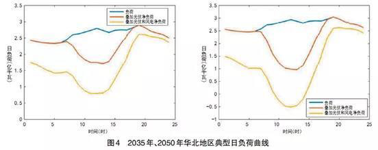 從日內特性來看,凈負荷小時級變化率顯著增加,且不確定性有所增強,午間負荷高峰成為凈負荷低谷,每日12時至20時之間靈活性需求最大。以華北地區(qū)為例,2035年華北地區(qū)負荷一小時功率變化最大值約為0.3億千瓦,占最大負荷的6.7%,而凈負荷一小時功率變化率最大值約為0.5,占最大負荷的13.8%;2050年凈負荷一小時功率變化最大值約為1.0億千瓦,占當年最大負荷的23.4%。隨著間歇性新能源(尤其是光伏發(fā)電)并網(wǎng)裝機比例持續(xù)擴大,凈負荷日曲線呈現(xiàn)“鴨子”形狀,12時至20時之間,凈負荷出現(xiàn)快速增長。午間光伏大發(fā)時,原本的負荷高峰會成為凈負荷低谷,甚至在午間可能出現(xiàn)凈負荷為負的情況。在15點至20點之間,用電負荷逐漸增長疊加,光伏出力快速衰減(見圖4)。