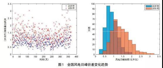 隨著間歇性可再生能源的裝機規(guī)模不斷擴大,風電和光伏出力波動范圍日益變大。以日峰谷差為例,風電出力日峰谷差冬季和春季較大,夏季和秋季相對較小。2035年全國風電功率日峰谷差最大值約為1.9億千瓦,中位數(shù)約為0.9億千瓦;2050年全國風電日峰谷差最大值約為3.0億千瓦,中位數(shù)約為1.3億千瓦。光伏出力日峰谷差春季和秋季出力最大,夏季次之,冬季出力最小。2035年全國光伏功率日峰谷差約為4.0億千瓦,中位數(shù)約為3.0億千瓦;2050年全國光伏日峰谷差最大值約為7.3億千瓦,中位數(shù)約為5.5億千瓦(見圖1、圖2)。