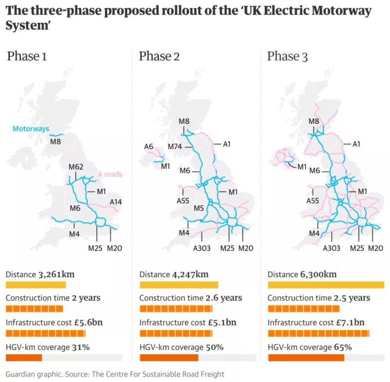 劍橋大學(xué)(Cambridge University)機械工程教授大衛(wèi)?塞本(David Cebon)表示,與電動道路相匹配的卡車只需要與現(xiàn)有特斯拉(Tesla)汽車相似大小的電池,就能覆蓋英國絕大部分地區(qū)。這項電子高速系統(tǒng)計劃將耗資193億英鎊,到2030年代末,英國除了最偏遠的地區(qū)外,英國其他地區(qū)都能用得上。這個項目投資效益較好,可望在15年內(nèi)回收。