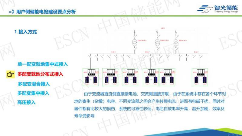 第一個(gè)是接入方法,接入方法很常規(guī),做電力系統(tǒng)一般會(huì)想到一個(gè)客戶一臺(tái)變壓器配一套儲(chǔ)能系統(tǒng)比較簡(jiǎn)單,就地集中接入,一臺(tái)配變這種效果非常好的,因?yàn)槭墙ㄔ谂渥兊南露?,不存在容量的影響??墒峭覀兘佑|到的客戶是有多臺(tái)配電的,往往是直接并聯(lián)接入,這就存在一個(gè)問(wèn)題:大量的電力電子儲(chǔ)能PCS直接并聯(lián)接入,由于交流側(cè)直接并聯(lián),系統(tǒng)中各個(gè)環(huán)節(jié)存在雜散的電容(共模電容),進(jìn)而有電磁干擾,會(huì)對(duì)電池壽命、效率和PCS及儲(chǔ)能系統(tǒng)的穩(wěn)定性造成很大的影響,這種方式還是要慎重考慮,因?yàn)閮?chǔ)能系統(tǒng)的穩(wěn)定性跟投資收益密切相關(guān)的。