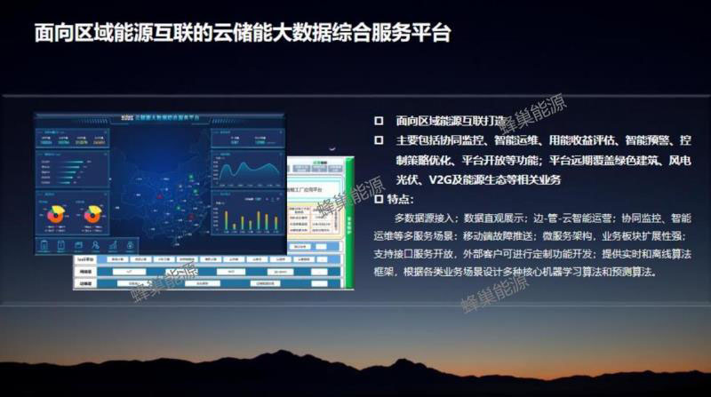 蜂巢能源云儲(chǔ)大數(shù)據(jù)綜合服務(wù)平臺(tái),主要是面向區(qū)域能源互聯(lián)打造,主要包括協(xié)同監(jiān)控、智能運(yùn)維、用能收益評(píng)估、智能預(yù)警、控制策略優(yōu)化、平臺(tái)開放等功能;平臺(tái)遠(yuǎn)期覆蓋綠色建筑、風(fēng)電光伏、V2G及能源生態(tài)等相關(guān)業(yè)務(wù)