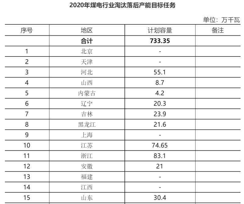 國(guó)家能源局發(fā)布關(guān)于下達(dá)2020年煤電行業(yè)淘汰落后產(chǎn)能目標(biāo)任務(wù)的通知稱(chēng),2020年全國(guó)計(jì)劃淘汰落后產(chǎn)能合計(jì)733.35萬(wàn)千瓦。淘汰機(jī)組中,凡屬未建成機(jī)組、2015年1月1日后無(wú)運(yùn)行記錄機(jī)組,不計(jì)入煤電行業(yè)淘汰落后產(chǎn)能目標(biāo)任務(wù)。列入本年度煤電行業(yè)淘汰落后產(chǎn)能目標(biāo)任務(wù)的煤電機(jī)組,除明確作為煤電應(yīng)急備用電源的機(jī)組外,須在2020年12月底前完成拆除工作。對(duì)于未納入國(guó)家年度淘汰落后產(chǎn)能目標(biāo)任務(wù),已停運(yùn)多年、短期內(nèi)不具備恢復(fù)生產(chǎn)條件的“僵尸”煤電機(jī)組,各地要結(jié)合實(shí)際情況,推動(dòng)企業(yè)盡快完成淘汰關(guān)停工作。