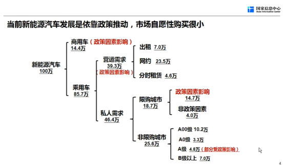 反觀私人市場(chǎng),雖然也出現(xiàn)不同程度下降,但限購(gòu)限行城市與雙非限城市整體的比例結(jié)構(gòu)還是比較穩(wěn)定的。把市場(chǎng)打開(kāi)以后可以看到,新能源汽車(chē)的100萬(wàn)輛銷(xiāo)量中:商用車(chē)?yán)锏墓?、市政、物流?chē)等,是政策拉動(dòng)的重要市場(chǎng);乘用車(chē)中,運(yùn)營(yíng)車(chē)輛占到了接近40萬(wàn)輛,這也是由于政策推動(dòng),剩下私人需求購(gòu)買(mǎi)的是46萬(wàn)左右的市場(chǎng);私人市場(chǎng)中限購(gòu)城市的銷(xiāo)量還占大部分,非限購(gòu)城市也就是20萬(wàn)輛的需求,去除非限購(gòu)城市中網(wǎng)約車(chē)的一部分A級(jí)車(chē),真正市場(chǎng)自愿購(gòu)買(mǎi)的需求也就不到20萬(wàn)輛的市場(chǎng)。當(dāng)然這里也有政策的功勞,因?yàn)檫€有新能源汽車(chē)補(bǔ)貼。