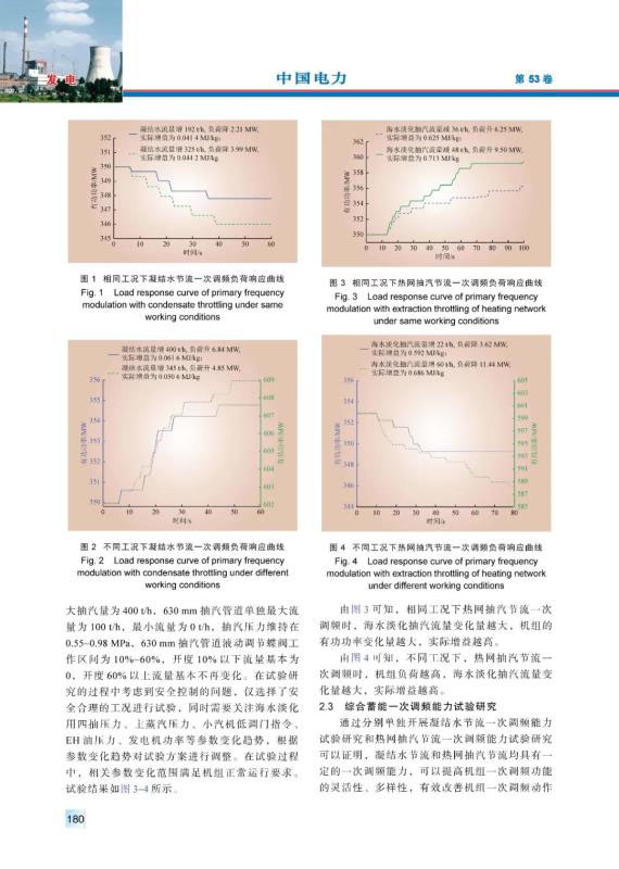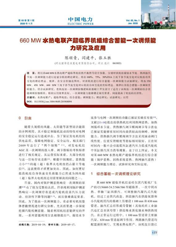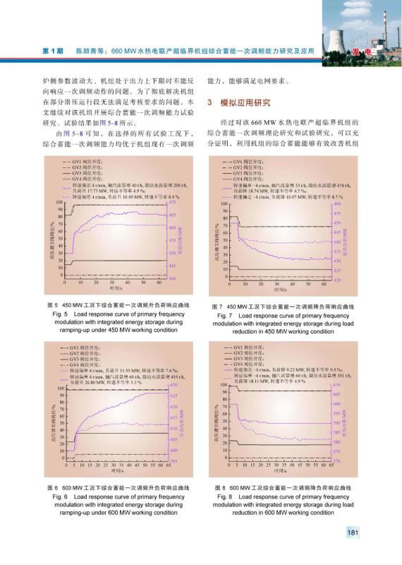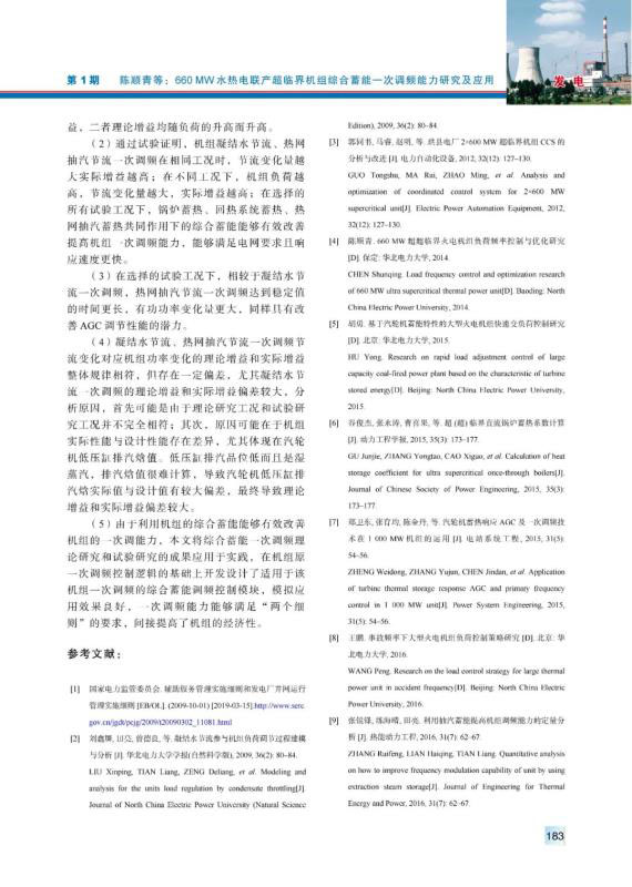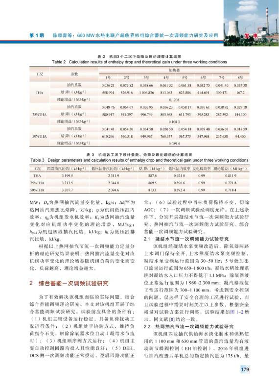 利用某660 MW水熱電聯(lián)產(chǎn)超臨界機(jī)組熱平衡圖等設(shè)計(jì)參數(shù),分別對(duì)該機(jī)組凝結(jié)水節(jié)流、熱網(wǎng)抽汽節(jié)流一次調(diào)頻能力進(jìn)行定量分析的理論研究,得出100%、75%、50%THA工況下各節(jié)流變化對(duì)應(yīng)機(jī)組功率變化的理論增益、規(guī)律。在安全控制范圍內(nèi),對(duì)該機(jī)組進(jìn)行綜合蓄能一次調(diào)頻能力試驗(yàn)研究,得出350 MW、450 MW、600 MW工況下各節(jié)流變化對(duì)應(yīng)機(jī)組功率變化的實(shí)際增益、規(guī)律以及綜合蓄能一次調(diào)頻實(shí)際能力。結(jié)合試驗(yàn)研究,在機(jī)組原一次調(diào)頻控制邏輯的基礎(chǔ)上開(kāi)發(fā)設(shè)計(jì)了適用于該機(jī)組一次調(diào)頻的綜合蓄能調(diào)頻控制模塊,模擬應(yīng)用效果良好,一次調(diào)頻能力能夠滿足相關(guān)要求,間接提高了機(jī)組的經(jīng)濟(jì)性。