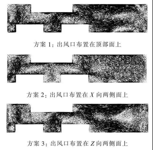 3 種出風(fēng)口布置方案下的集裝箱內(nèi)部截面(Y=2 m)速度矢量如圖4 所示??梢钥闯鲈谙嗤乃俣葮?biāo)尺下:方案3 集裝箱內(nèi)速度矢量較大,在集裝箱內(nèi)部出現(xiàn)幾個(gè)渦流,使集裝箱內(nèi)部工質(zhì)充分得到擾動(dòng),換熱時(shí)間較長(zhǎng),因此平均溫度較低;方案2 速度矢量最小,由于一個(gè)出風(fēng)口距離入風(fēng)口較近,空氣剛進(jìn)入儲(chǔ)能集裝箱,就有部分從左側(cè)的出風(fēng)口流出,即圖4 中流動(dòng)最為密集的區(qū)域,換熱時(shí)間較短,換熱量較少,因此平均溫度較高;方案1 集裝箱內(nèi)工質(zhì)流速較快,工質(zhì)分布均勻,但是沒(méi)有出現(xiàn)渦流,因此換熱效果介于方案2 與方案3 之間。