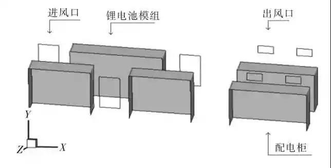 儲(chǔ)能系統(tǒng)形式多樣,儲(chǔ)能集裝箱因其具有占地少、便于安裝、可移動(dòng)、一體性強(qiáng)等特點(diǎn)在中小型電站應(yīng)用十分廣泛[2]。儲(chǔ)能系統(tǒng)聚集的電池?cái)?shù)目很多,電池容量和功率較大。大量的電池緊密排列在一個(gè)空間內(nèi),運(yùn)行工況復(fù)雜多變,容易造成產(chǎn)熱不均勻、溫度分布不均勻、電池間溫差較大等問(wèn)題。長(zhǎng)此以往,必然會(huì)導(dǎo)致部分電池的充、放電性能,容量和壽命周期等下降,從而影響整個(gè)系統(tǒng)的性能,嚴(yán)重時(shí)會(huì)引發(fā)熱失控,造成事故[5]。虞跨海等人[6]研究了單體鋰離子儲(chǔ)能電池三維電化學(xué)-熱耦合模型,開(kāi)展了不同放電條件下的電池溫升曲線數(shù)值仿真和實(shí)驗(yàn)測(cè)試,以了解鋰電池內(nèi)部具體的溫度分布情況。由于儲(chǔ)能系統(tǒng)價(jià)格高昂,為保證電池模組的安全運(yùn)行及使用壽命,對(duì)模組進(jìn)行有效的散熱設(shè)計(jì)顯得極其重要。鋰電池?zé)峁芾砑夹g(shù)主要包括空冷、液冷、相變冷卻和熱管冷卻等方法[7]。王帥等人[8]采用了自然對(duì)流散熱和強(qiáng)制風(fēng)冷2 種方式來(lái)分析超級(jí)電容模組,結(jié)果表明自然散熱不能滿足溫度要求,強(qiáng)制風(fēng)冷才能有效抑制模組溫升。鐘國(guó)斌等人[5]通過(guò)分析鋰電池的熱特性,提出可有效組合空冷、水冷、熱管冷卻和相變冷卻等幾種熱管理技術(shù)來(lái)構(gòu)成儲(chǔ)能集裝箱的熱管理系統(tǒng),從而降低電池的溫度。FAN 等人[9]研究了不同電池間距和空氣流量對(duì)電池組溫度分布的影響,結(jié)果表明在流量不變時(shí),電池間的溫度分布隨著電池間距的增大而逐漸均勻。李彩紅等人[10]基于鋰離子動(dòng)力電池生熱模型仿真與實(shí)驗(yàn)的研究,驗(yàn)證了局部強(qiáng)化射流冷卻散熱系統(tǒng)在不同充放電倍率下的儲(chǔ)能系統(tǒng)電池模塊中的散熱效果。MAHAMUD 等人[11]提出了一種空氣流動(dòng)方向反復(fù)變換的冷卻方式,這種方式能夠讓電池溫差下降約72%,但是提高了系統(tǒng)的復(fù)雜程度。為改善中部電池的散熱,YU等人[12]為電池組配置了2 個(gè)風(fēng)扇,加強(qiáng)了局部區(qū)域的通風(fēng)效果。由此可見(jiàn),通風(fēng)冷卻是儲(chǔ)能集裝箱最基本也最主要的溫度控制方式。本文在通風(fēng)冷卻的基礎(chǔ)上分析通風(fēng)口的數(shù)量、位置等因素對(duì)冷卻效果的影響,優(yōu)化儲(chǔ)能集裝箱的溫度分布,通過(guò)CFD 數(shù)值模擬軟件建立儲(chǔ)能集裝箱的物理模型,分析不同工況下集裝箱內(nèi)的溫度分布情況。