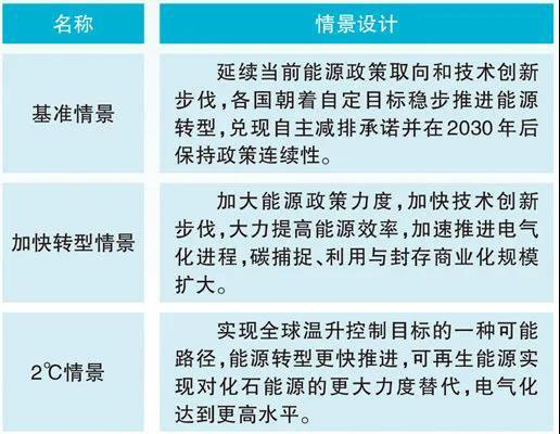 在經(jīng)濟發(fā)展、人口增長預期的基礎(chǔ)上,考慮能源政策、技術(shù)進步等方面發(fā)展趨勢,面向2050年設(shè)計了基準、加快轉(zhuǎn)型、2℃三個情景。