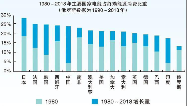 2018年,全球電能占終端能源的消費比重為19.2%;發(fā)達國家普遍較高,中國為24%。