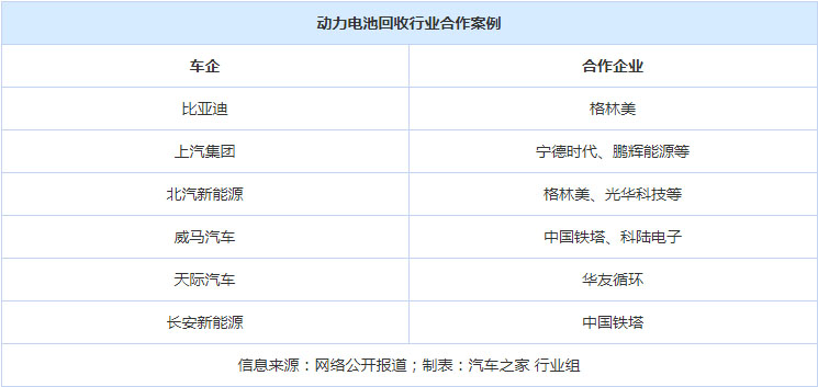 羅蘭貝格管理咨詢公司執(zhí)行總監(jiān)吳釗看來,具備客戶和渠道基礎(chǔ)是解決動力電池回收問題的核心,考慮到電池回收的運營體系復(fù)雜性,目前市場上主流做法為“抱團合作”,即車企、電池企業(yè)及回收企業(yè)達成戰(zhàn)略合作,利用各自的優(yōu)勢,解決動力電池回收難題。