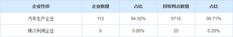汽車之家統(tǒng)計出工信部公布的動力電池回收網(wǎng)點情況,截至2020年5月,全國共有回收服務(wù)網(wǎng)點8741個,其中涉及整車企業(yè)112家,梯次利用企業(yè)6家。從網(wǎng)點分布情況來看,車企建立的回收網(wǎng)點占據(jù)絕大部分?jǐn)?shù)量,在全國各地均有覆蓋。從具體網(wǎng)點來看,以汽車企業(yè)4S店網(wǎng)絡(luò)為主,也有少部分與車企合作的報廢拆解企業(yè)建立的網(wǎng)點,以及梯次利用企業(yè)建立的網(wǎng)點。