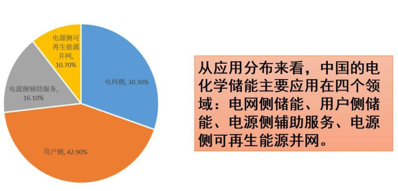 接下來(lái)是儲(chǔ)能技術(shù)應(yīng)用的幾個(gè)領(lǐng)域,從應(yīng)用分布來(lái)看,中國(guó)的電化學(xué)儲(chǔ)能主要應(yīng)用在四個(gè)領(lǐng)域:電網(wǎng)側(cè)儲(chǔ)能、用戶側(cè)儲(chǔ)能、電源側(cè)輔助服務(wù)、電源側(cè)可再生能源并網(wǎng)。
