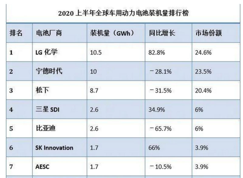 具體來看,LG化學(xué)的裝機(jī)量達(dá)到10.5 GWh,同比大漲82.8%,從而由去年同期的第4位躍升至第1位。寧德時(shí)代則以10 GWh的裝機(jī)量排名第2,市場(chǎng)份額為23.5%。之后是松下的8.7 GWh,市場(chǎng)份額為20.4%。從裝機(jī)量來看,以上三家廠商將其他企業(yè)遠(yuǎn)遠(yuǎn)甩在了后面。