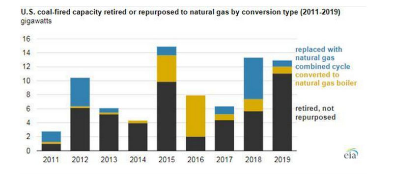 截至2010年底,美國的燃煤發(fā)電量為316.8吉瓦,但是到2019年底,已淘汰了其中的49.2吉瓦,將14.3吉瓦的鍋爐轉換為天然氣,還有15.3吉瓦被天然氣聯(lián)合循環(huán)代替。嚴格的排放標準,低廉的天然氣價格以及更高效的新型天然氣渦輪技術推動了工廠從煤炭到天然氣的轉型。