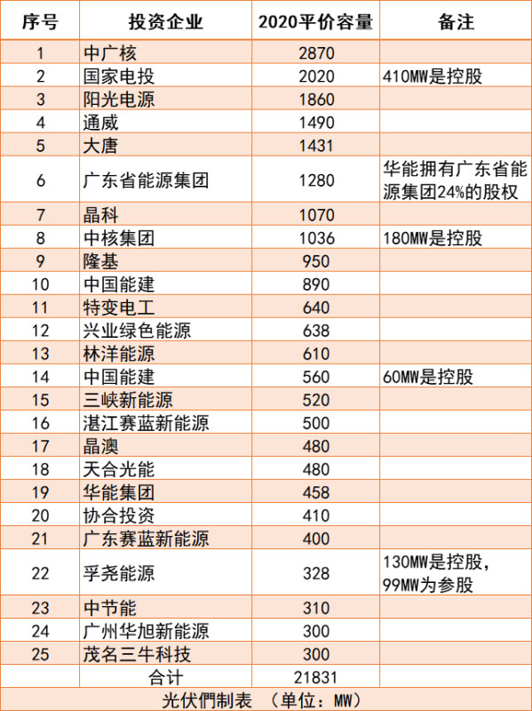 根據(jù)項目名單,光伏們梳理了單體規(guī)模1MW以上平價光伏項目的最高級母公司信息,項目所涉企業(yè)超過160家,下圖為TOP 40的項目以及業(yè)主信息。40家企業(yè)總裝機規(guī)模23.39GW,占全部平價光伏項目容量的68%。相比2019年,2020年平價項目投資企業(yè)的集中度顯著降低。