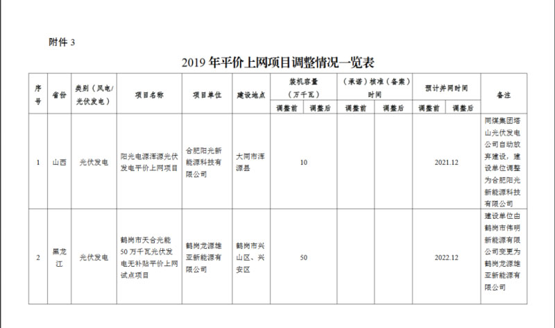 3.2019年平價上網(wǎng)項目信息調整情況一覽表