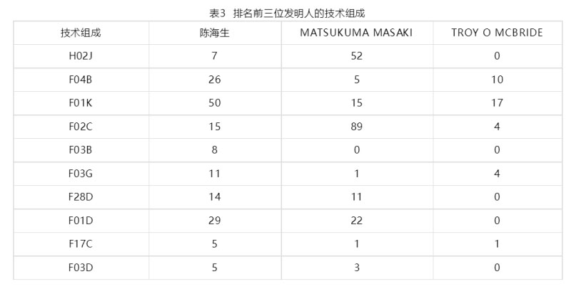 統計排名前三位發(fā)明人的技術組成情況:陳海生在F01K(蒸汽機裝置、貯汽器、不包含在其他類目中的發(fā)動機裝置、應用特殊工作流體或循環(huán)的發(fā)動機)技術分支上的發(fā)明專利量相對于其他分支最高,為50件;在F01D(非變容式機器或發(fā)動機,如汽輪機)及F04B(液體變容式機械;泵)技術分支上申請量相對較高,分別為29件及26件。陳海生在F01K、F01D及F04B等技術分支上均有一定的研究,研究范圍較廣。MATSUKUMA MASAKI在F02C(燃氣輪機裝置;噴氣推進裝置的空氣進氣道;空氣助燃的噴氣推進裝置燃料供給的控制)技術分支上發(fā)明量較高,為89件,說明在此技術分支上研究的較深入。TROY O MCBRIDE在F01K(蒸汽機裝置;貯汽器;不包含在其他類目中的發(fā)動機裝置;應用特殊工作流體或循環(huán)的發(fā)動機)上發(fā)明量較高,為17件。