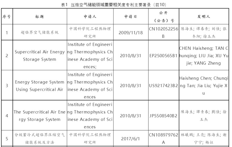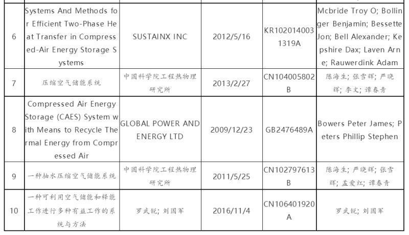 根據檢索結果,按照檢索相關度及專利價值度綜合排序,列出壓縮空氣儲能領域前10件重要相關度的專利著錄信息。