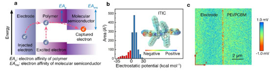 a:聚合物-分子半導(dǎo)體復(fù)合體系能級(jí)與電荷轉(zhuǎn)移示意圖. b:分子半導(dǎo)體靜電勢(shì)分布. c:電極/聚合物界面表面電勢(shì)分布.