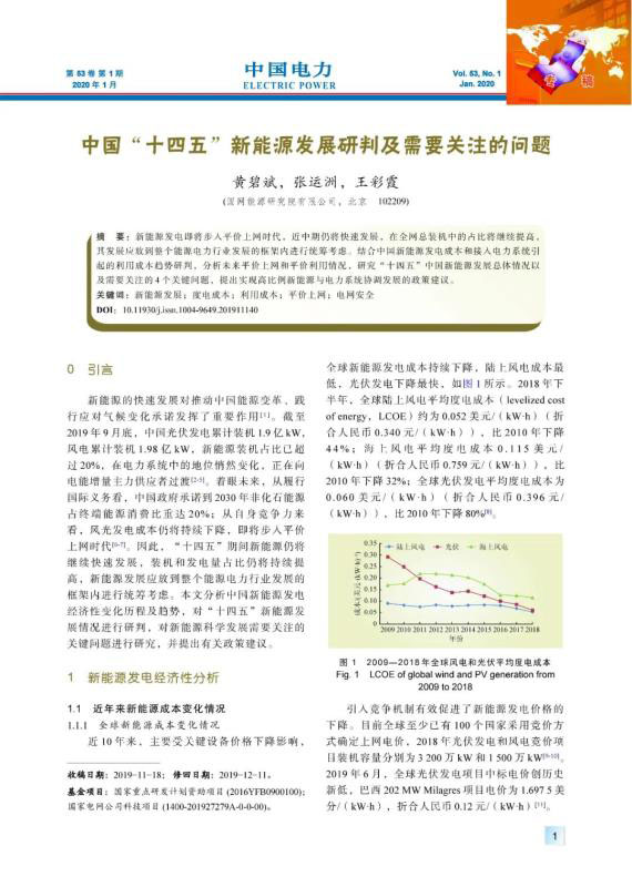 新能源發(fā)電即將步入平價(jià)上網(wǎng)時(shí)代,近中期仍將快速發(fā)展,在全網(wǎng)總裝機(jī)中的占比將繼續(xù)提高,其發(fā)展應(yīng)放到整個(gè)能源電力行業(yè)發(fā)展的框架內(nèi)進(jìn)行統(tǒng)籌考慮。結(jié)合中國(guó)新能源發(fā)電成本和接入電力系統(tǒng)引起的利用成本趨勢(shì)研判,分析未來(lái)平價(jià)上網(wǎng)和平價(jià)利用情況,研究“十四五”中國(guó)新能源發(fā)展總體情況以及需要關(guān)注的4個(gè)關(guān)鍵問(wèn)題,提出實(shí)現(xiàn)高比例新能源與電力系統(tǒng)協(xié)調(diào)發(fā)展的政策建議。