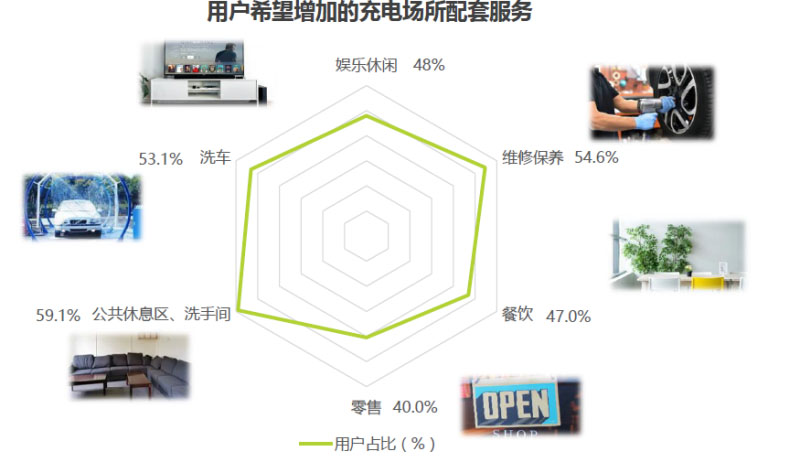 充電站其實(shí)充滿了想象空間,由于車主充電時(shí)間較長(zhǎng),部分公共充電場(chǎng)所附近沒(méi)有配套設(shè)施極大程度上影響了車主的充電體驗(yàn)。根據(jù)艾瑞咨詢的統(tǒng)計(jì),59.1%的用戶最希望加增的是公共休息區(qū),其次的需求是54.6%的用戶希望可以在充電站附近進(jìn)行日常的維修保養(yǎng),還有洗車、休閑娛樂(lè)、餐飲、零售等需求也都很高。