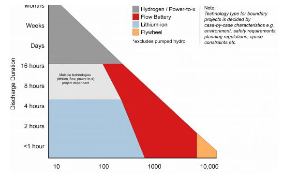 該圖表概括了不同儲能技術(shù)在未來的儲能技術(shù)生態(tài)系統(tǒng)中的適用范圍