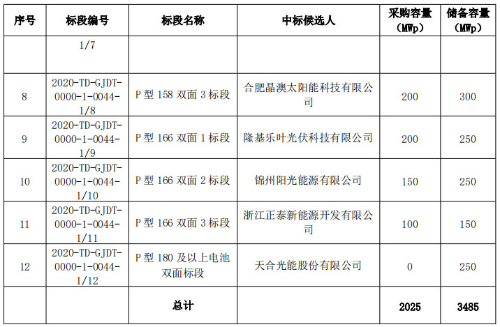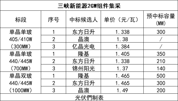 近日,國(guó)家電投、三峽新能源2020年組件集采相繼定標(biāo),包括晶科、億晶光電、晶澳、東方日升、天合光能、正泰、隆基等入圍。在國(guó)家電投5.51GW集采中,億晶光電(2.01GW)、晶澳(1GW)、東方日升(900MW)、隆基(750MW)、錦州陽(yáng)光(400MW),天合光能、晶科與正泰分別中標(biāo)250MW;三峽新能源2GW組件集采中,隆基預(yù)中標(biāo)850MW、東方日升810MW、晶澳200MW、錦州陽(yáng)光140MW。