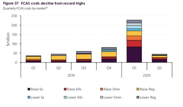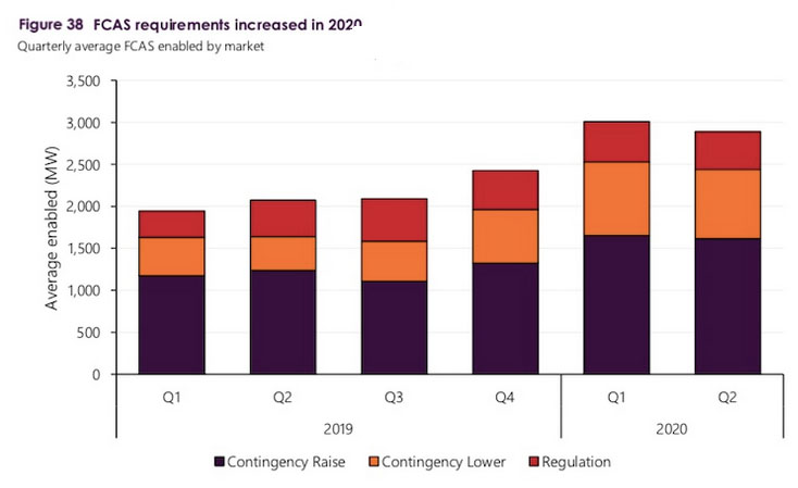 大型電池儲(chǔ)能系統(tǒng)為此獲得了豐厚的回報(bào),但是盡管澳大利亞能源市場(chǎng)運(yùn)營(yíng)商(AEMO)為幫助管理電網(wǎng)而對(duì)頻率控制與輔助服務(wù)(FCAS)的需求急劇增加,但頻率控制與輔助服務(wù)(FCAS)的收入仍在第二季度急劇下降。
