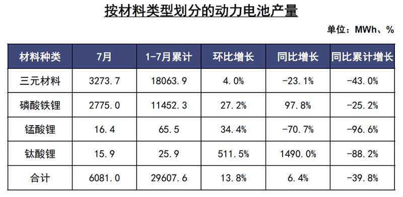 1-7月,我國動力電池產(chǎn)量累計29.6GWh,同比累計下降39.8%。其中三元電池產(chǎn)量累計18.1GWh,占總產(chǎn)量61%,同比累計下降43.0%;磷酸鐵鋰電池產(chǎn)量累計11.5GWh,占總產(chǎn)量38.7%,同比累計下降25.2%。