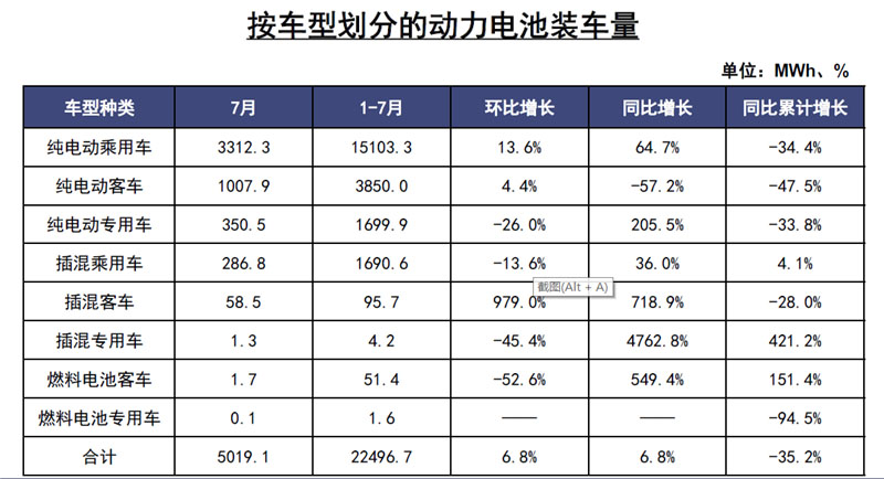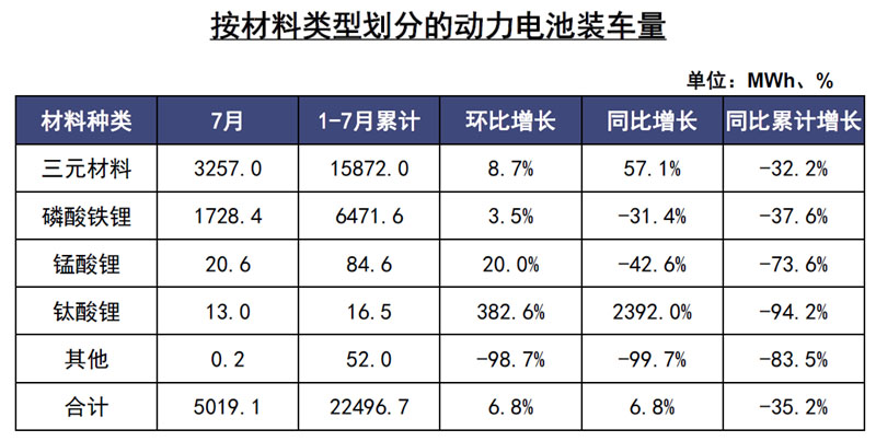 前7月,我國動力電池裝車量累計22.5GWh,同比累計下降35.2%。其中三元電池裝車量累計15.9GWh,占總裝車量70.6%,同比累計下降32.2%;磷酸鐵鋰電池裝車量累計6.5GWh,占總裝車量28.8%,同比累計下降37.6%。