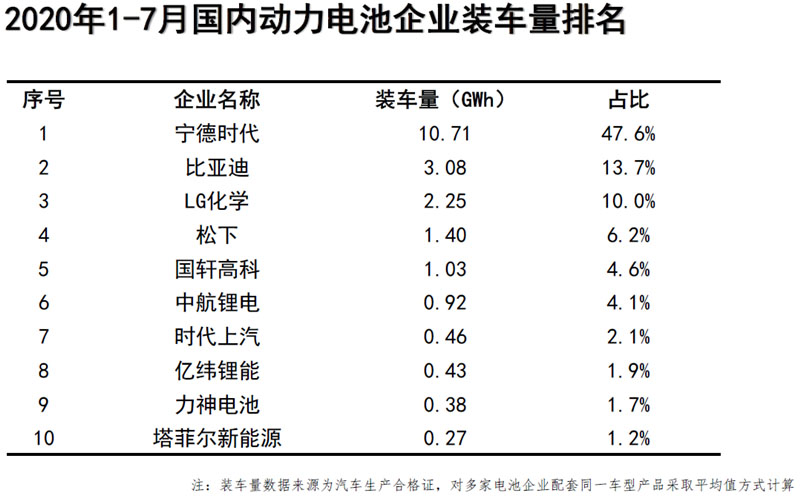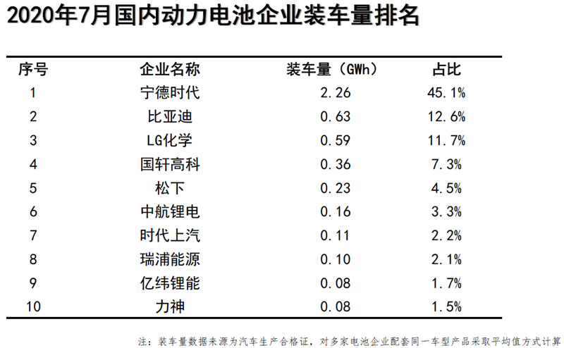 7月動力電池企業(yè)裝車量排名中,寧德時代、比亞迪、LG化學(xué)分別以2.26GWh、0.63GWh和0.59GWh包攬前三,比亞迪超越LG化學(xué)上升至第二位。