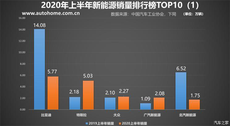 2020年車市遭遇“寒冬“,新能源市場更甚。據(jù)中汽協(xié)數(shù)據(jù)顯示,1-6月新能源汽車產(chǎn)銷分別完成39.7萬輛和39.3萬輛,同比分別下降36.5%和37.4%。2020年上半年,排在新能源銷量前五的品牌分別是:比亞迪、特斯拉、大眾、廣汽新能源、北汽新能源。和去年相比,除了第一名比亞迪沒有變化外,剩下的位次都有變動。