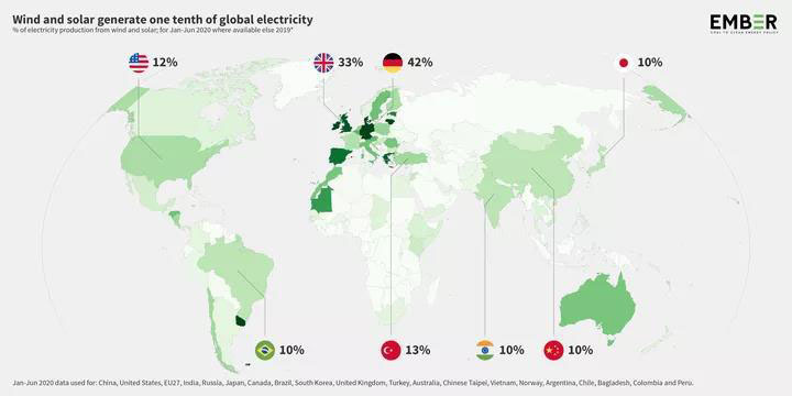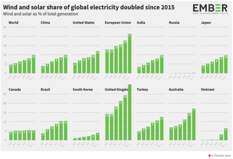 許多主要國(guó)家現(xiàn)在大約十分之一以上的電力來(lái)自風(fēng)能和太陽(yáng)能:中國(guó)(10%)、美國(guó)(12%)、印度(10%)、日本(10%)、巴西(10%)、土耳其(13%)、英國(guó)(33%)、德國(guó)(42%),而歐盟的風(fēng)能和太陽(yáng)能占比為21%。俄羅斯是迄今為止基本沒(méi)有發(fā)展風(fēng)能和太陽(yáng)能的國(guó)家,只有0.2%的電力來(lái)自風(fēng)能和太陽(yáng)能。