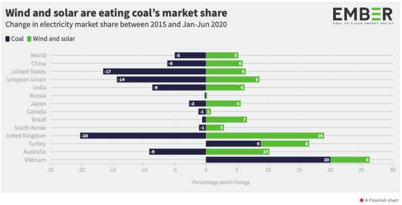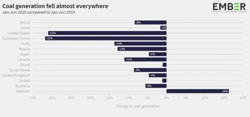 與2019年上半年相比,全球煤炭發(fā)電量在2020年上半年下降了8.3%。這是繼2019年同比下降3%之后,1990年以來(lái)的創(chuàng)紀(jì)錄跌幅。2020年上半年的煤電下降70%可歸因于新冠疫情導(dǎo)致的電力需求下降,但30%可歸因于風(fēng)能和太陽(yáng)能發(fā)電量的增加。美國(guó)和歐盟正競(jìng)相減少煤電,降幅分別為31%和32%。中國(guó)煤電只下降了2%,這意味著中國(guó)在全球煤炭發(fā)電量中的份額從2019年的50%上升到今年上半年的54%;而2015年時(shí)中國(guó)煤電占全球比例為44%。