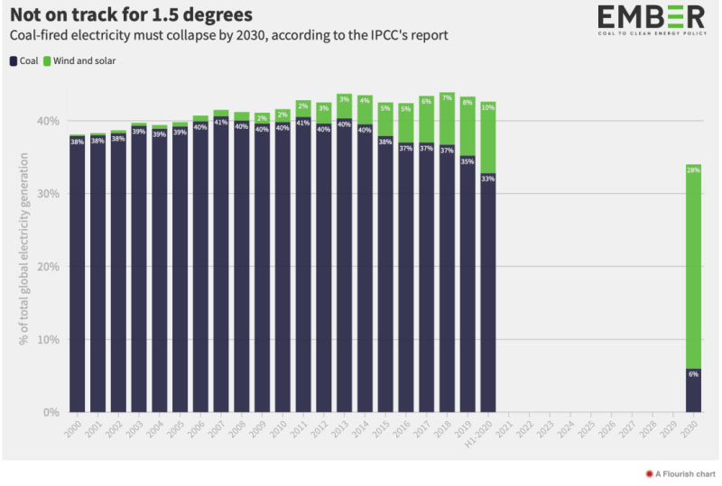 為了實(shí)現(xiàn)巴黎協(xié)定的溫升不超過(guò)1.5攝氏度的目標(biāo),在未來(lái)10年中煤電需要每年下降13%。但是,即使在全球性的新冠疫情大流行期間,煤炭發(fā)電量在2020年上半年也只下降了8%。因此,在目前的趨勢(shì)下,實(shí)現(xiàn)巴黎協(xié)定的目標(biāo)無(wú)望。