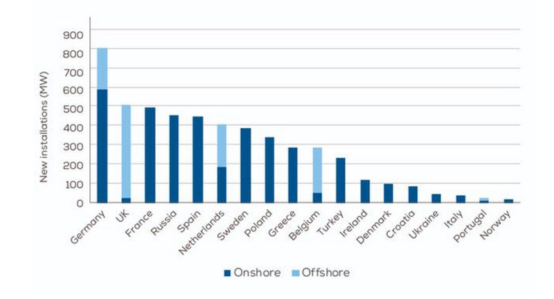 陸上風電的安裝量(3.9GW)比前三年平均水平(3.7 GW)稍好一些。海上風電的安裝量(1.2GW)則低于近三年的平均水平(1.5GW)。