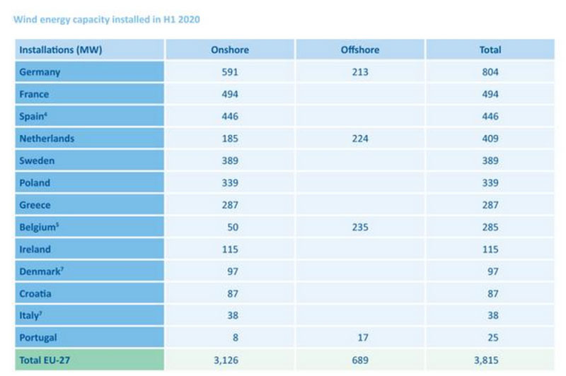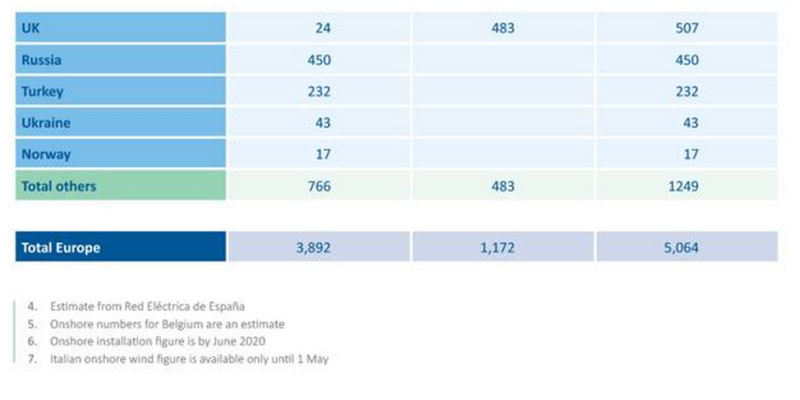 盡管風能行業(yè)在上半年受到嚴重干擾,但裝機水平與前幾年相當。 下表為2020年上半年歐洲各國裝機統(tǒng)計表。